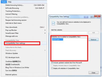 2. At the top of the web browser, click Tools and select Compatibility View settings in the menu.