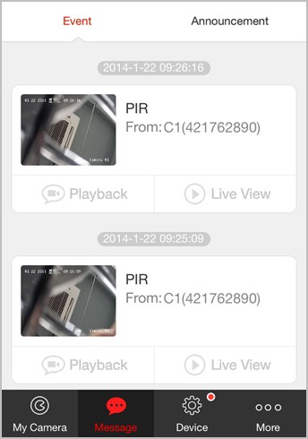 In My Camera page, click Massage to enter the event massage page. You can view the alarm messages that were sent to your mobile phone after the Alarm Push Notice was enabled.。 Click on the Mark All as Read button to set all unread message as read.