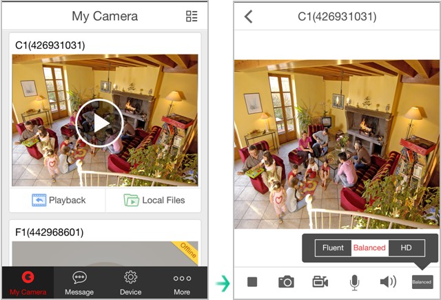 In My Camera page, click the icon on the thumbnail of the device to view real-time video of the required scene. Click the icon Balanced and you can set image quality as Fluent, Balanced, and HD.